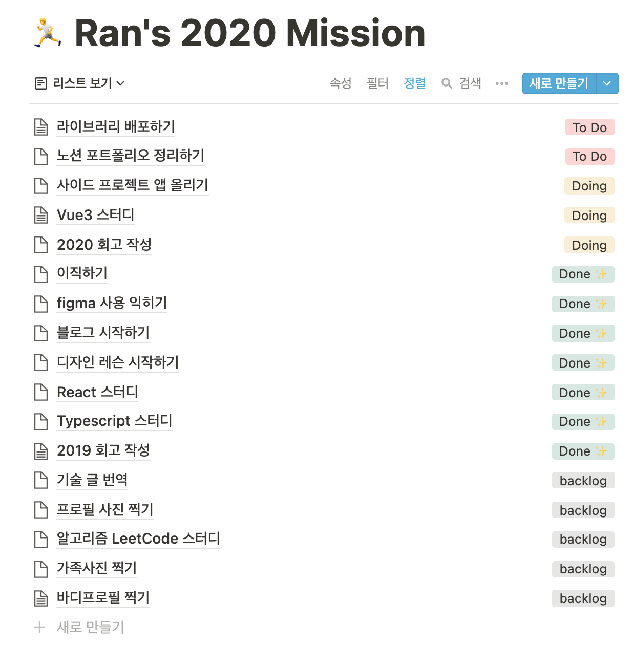 2020년에 들어가며 어떤 목표를 세웠었는지 살펴보자. 주제가 제각각이지만 하고 싶었던 일 17가지 중, 10가지는 시도도 하고 마무리까지 했다. 한 해가 빠르게 지나간 것 같은데, 정리된 표를 보니 한눈에 들어왔다.